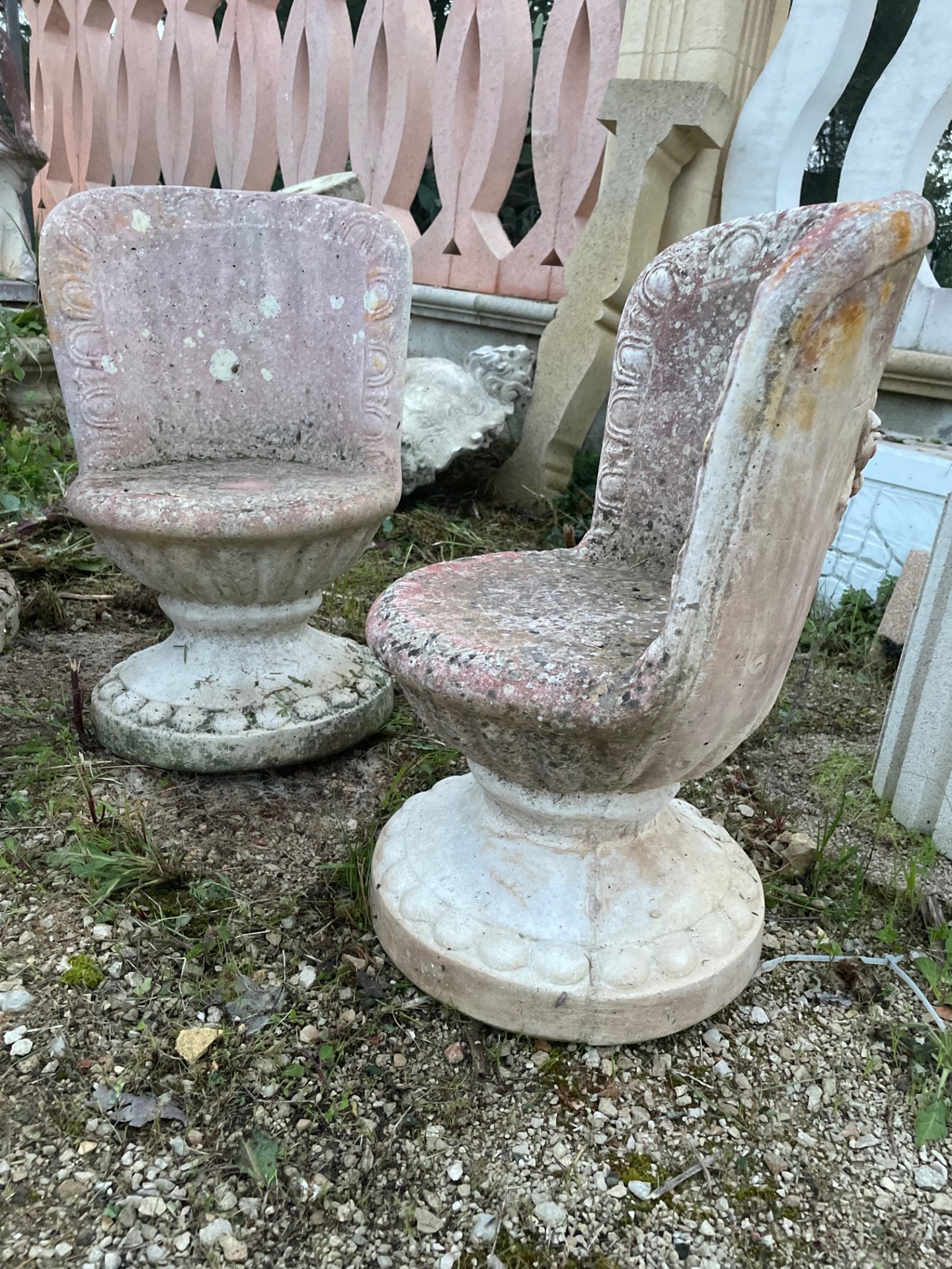 Coppia di sedie antichizzate naturalmente h 51 cm in cemento bianco e polvere di marmo.